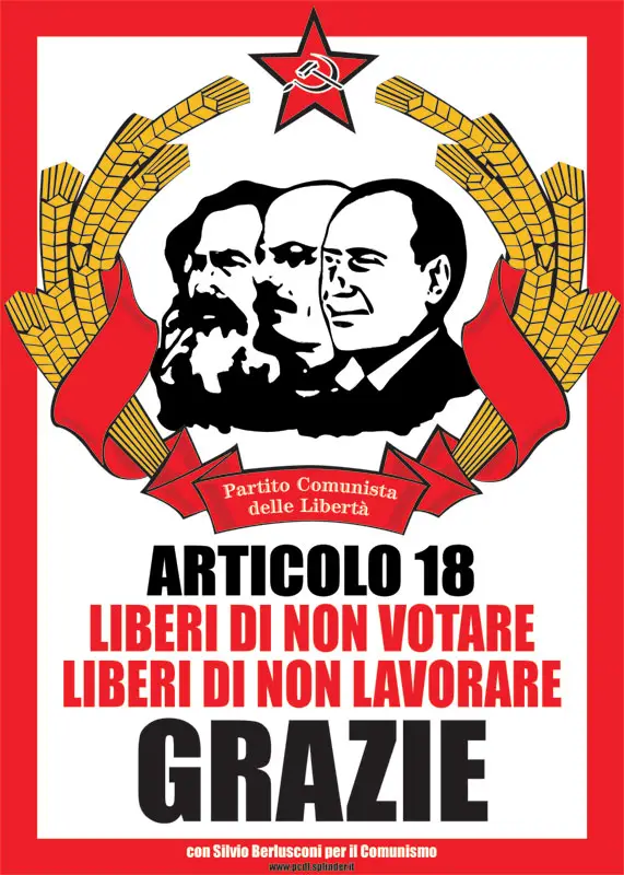 Political street poster of a self-styled “Communist Party of Freedom” with Marx, Lenin and Berlusconi to thanks people who don’t vote at referendum for job reinstatement. It claim: “Free to not vote, free to not work.